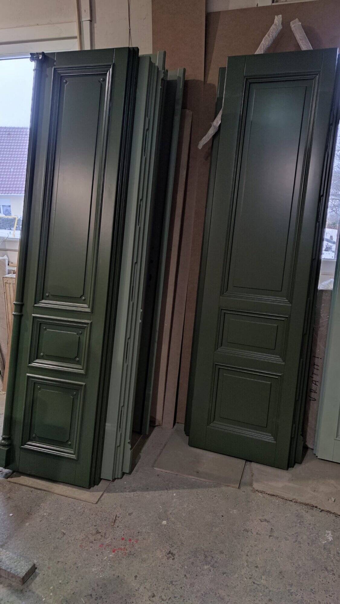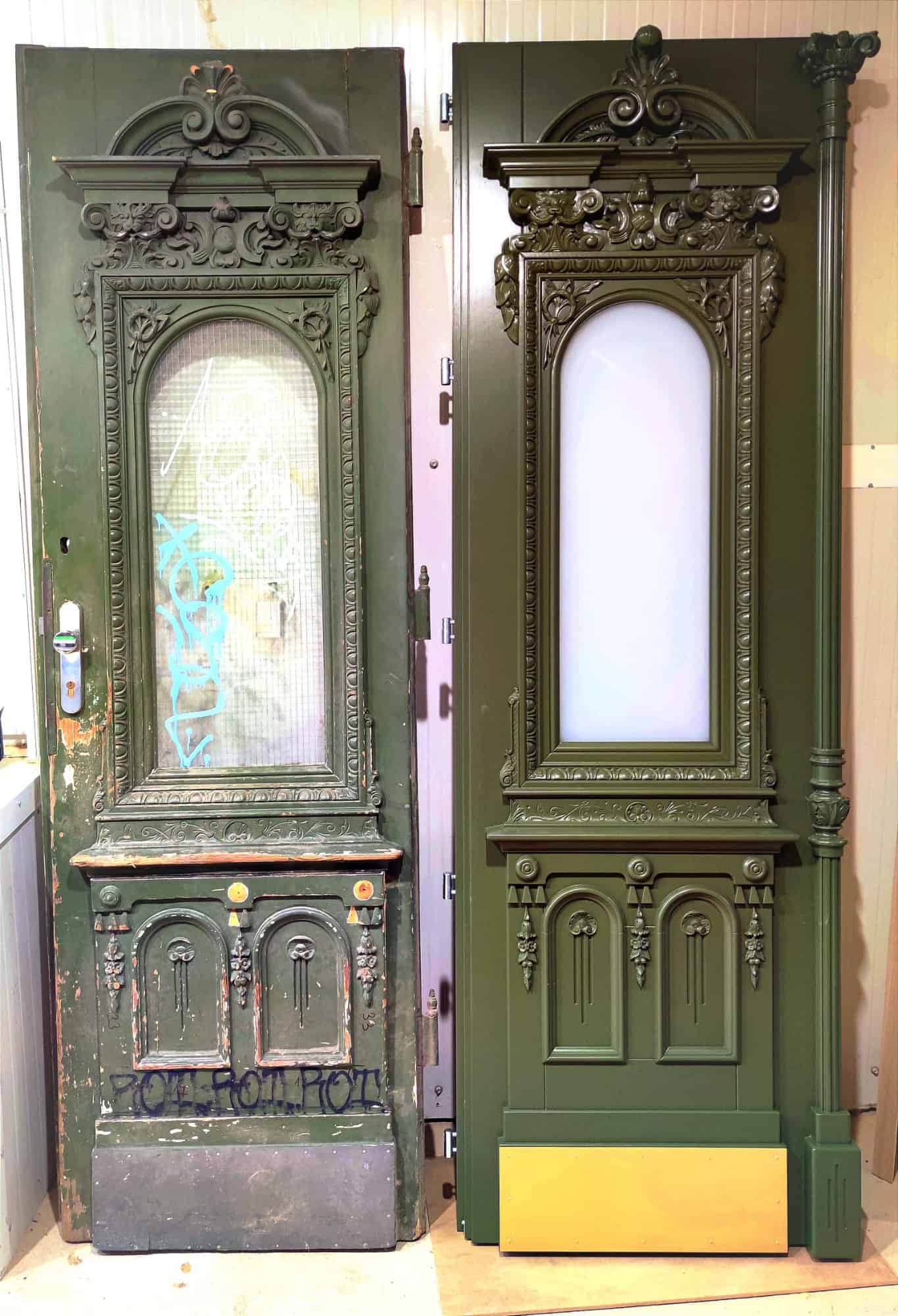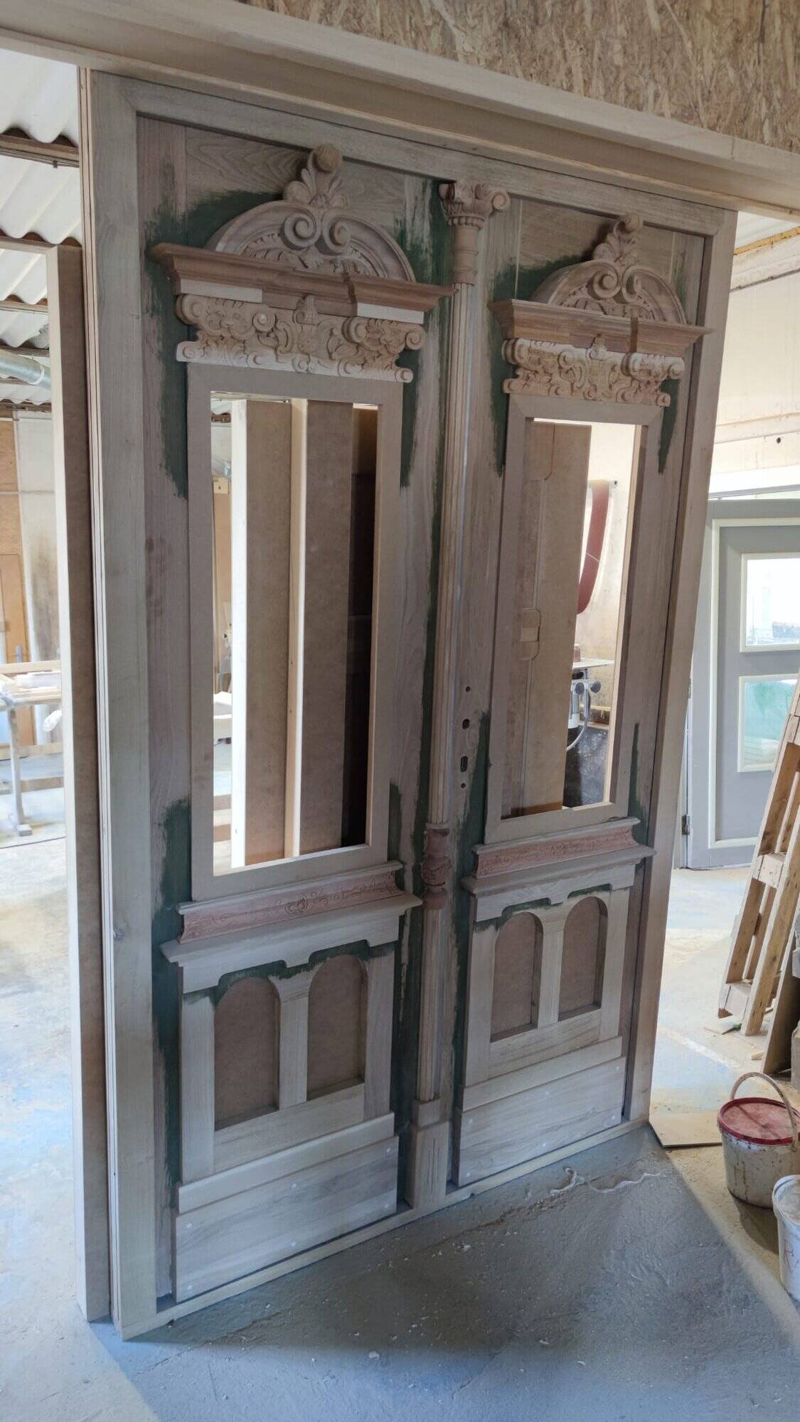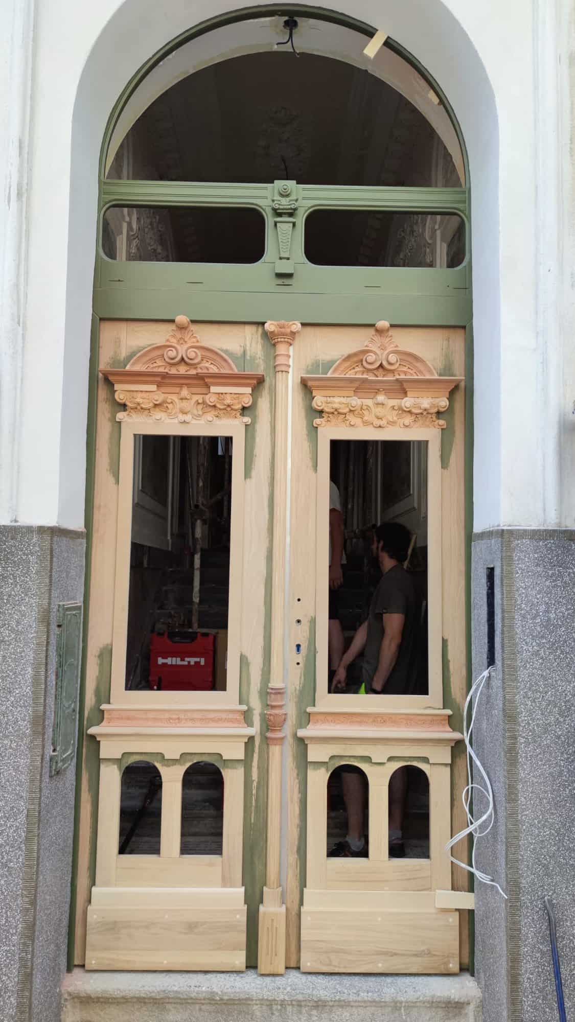 Dveře byly vyrobeny jako kompletní kopie původních prvků, takže styl i plastické detaily odpovídají tomu, co bylo na objektu původně. Jednotlivé prvky tak harmonicky navazují na architektonický koncept budovy.