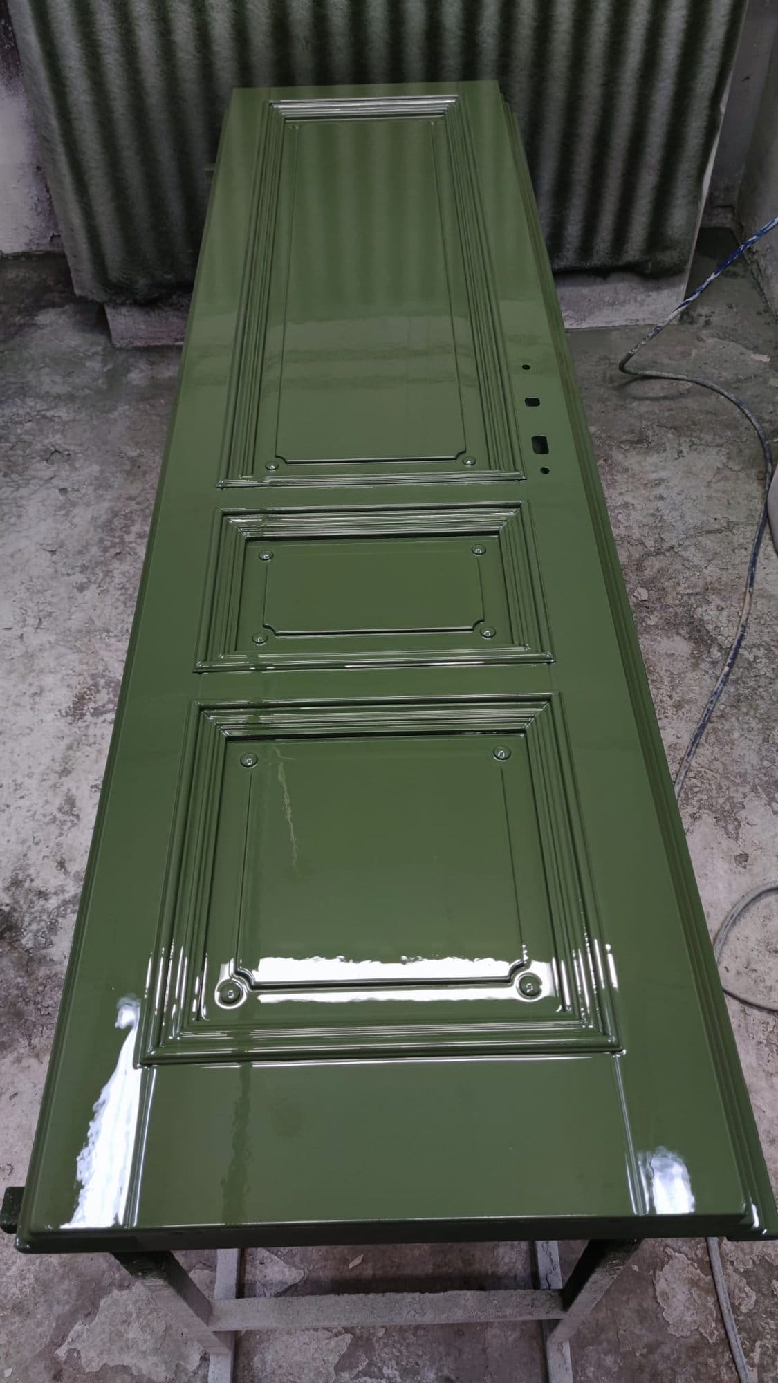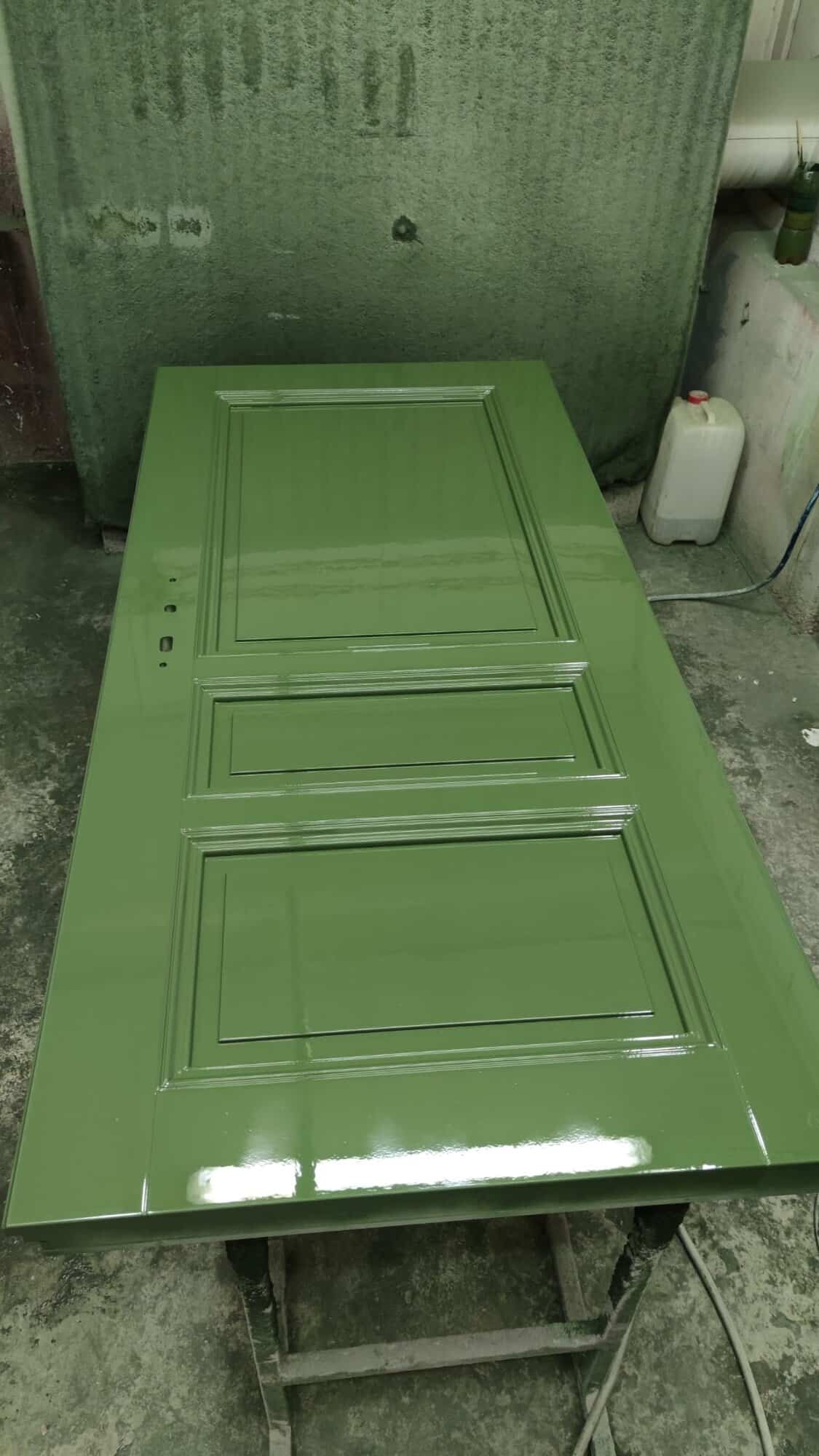 Vstupní domovní dveře mají odstín RAL 6003, kde i základová vrstva byla barevně sladěna do odstínu RAL6003, složení barvy uzpůsobeno pro materiál dub a mahagon, ze kterého jsou řezby zhotoveny.